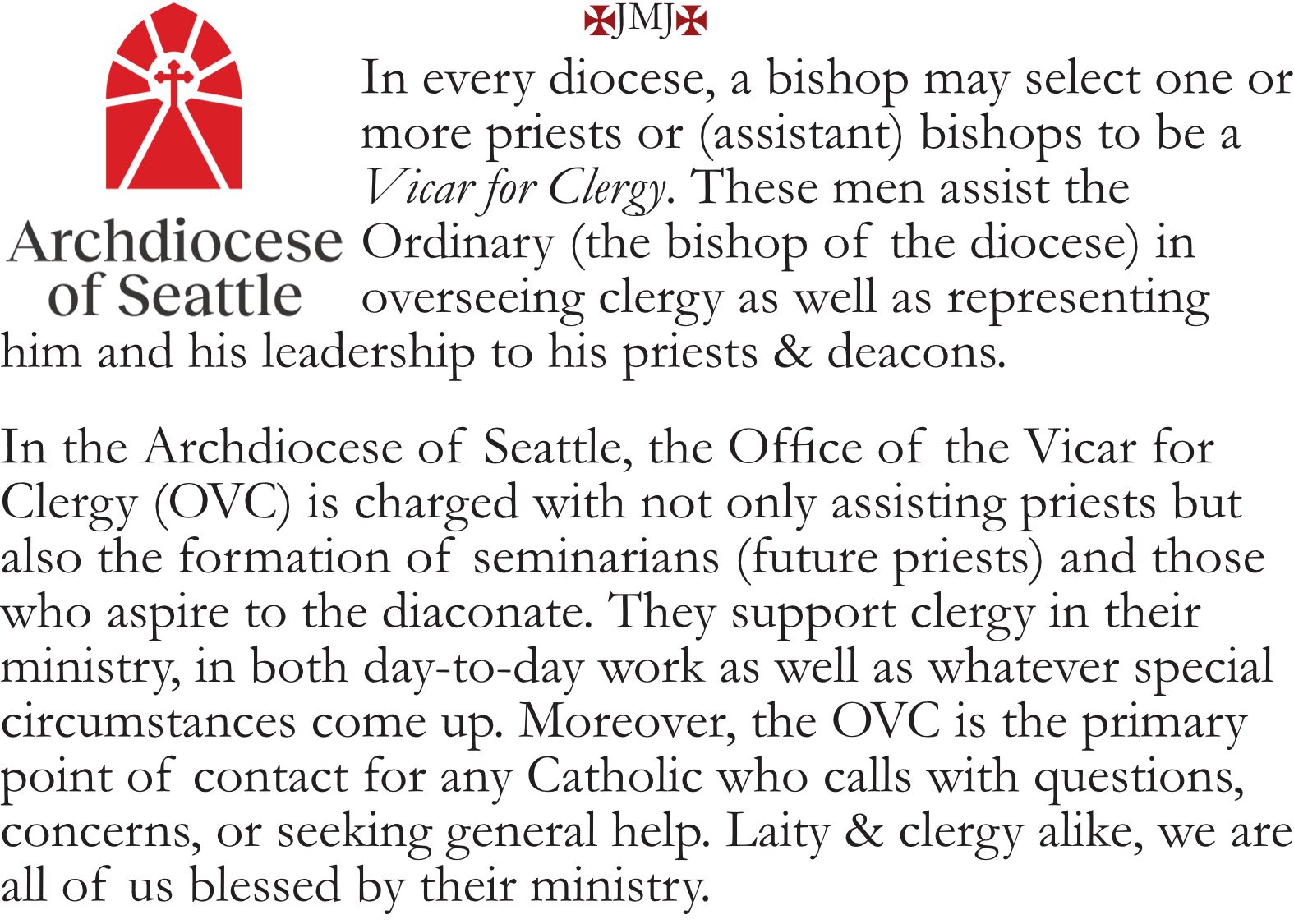 You might rightly wonder who runs this whole thing. In fact, it is an office of the chancery that affects every parish and priest in the archdiocese: the Office of the Vicar for Clergy (or OVC, for short). It is a modest staff – three priests, a deacon, and seven laity. If you’ve ever called about a question or difficulty in your parish (or with your priest!), you’ve assuredly talked with someone in this office. They are the face – or voice – of the chancery and, by extension, of the archbishop himself.